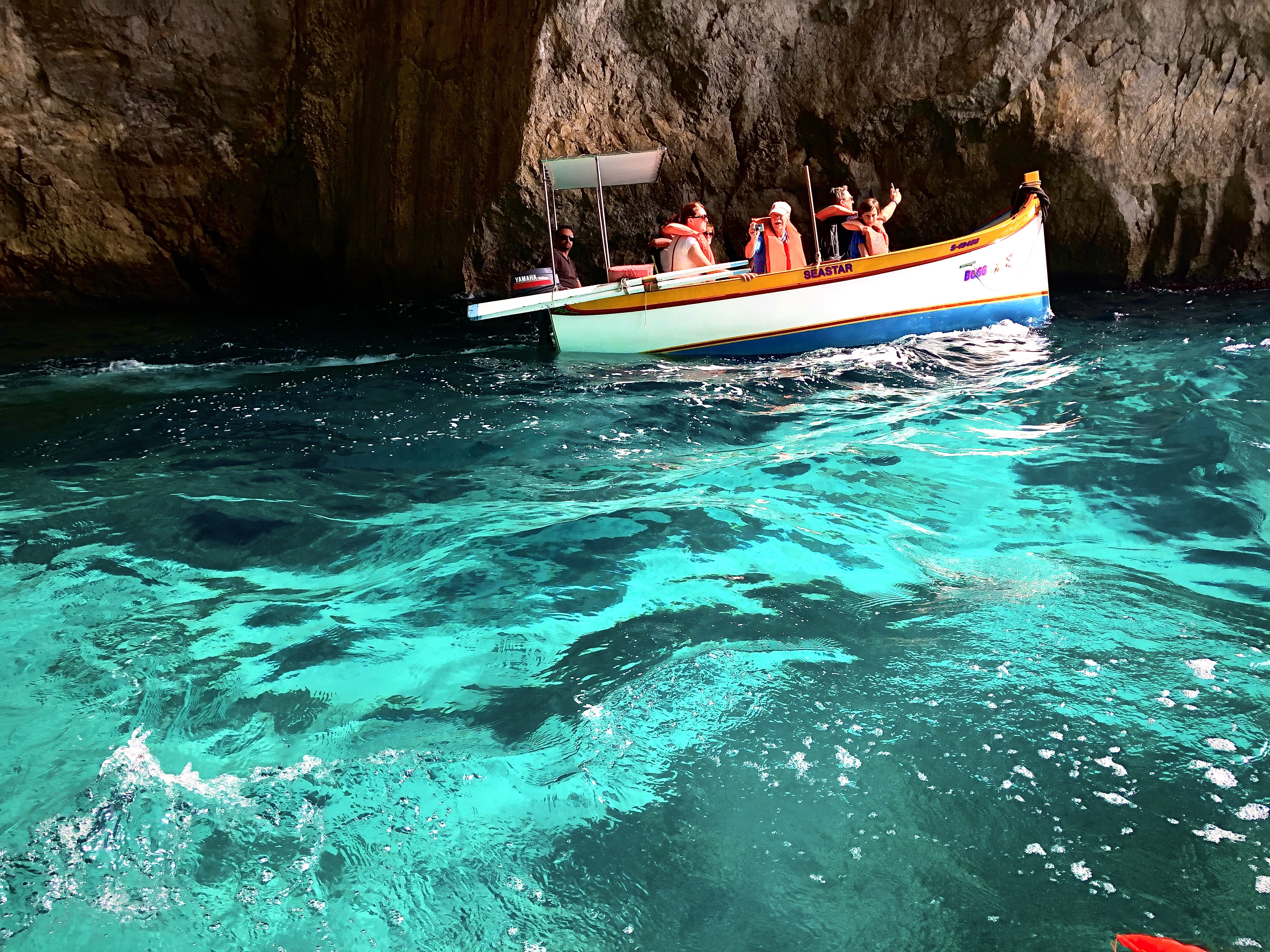 Angekommen im Süden, genauer gesagt in Malta haben wir uns dazu entschieden eine kleine Insel Taxi Rundfahrt zu machen, die Taxen im Süden sind günstig, so haben wir zu 4. 5€ p.p bezahlt. Wir sind zu einer Bucht gefahren wo man mit kleinen Booten in die Höhlen fahren konnte, laut Werbung war dies „the bluest Point in Malta!“ also rein da. Die See war sehr rau, aber wir kannten uns ja mit Seegang aus. Das Wasser war einfach unglaublich blau, es wäre so schön gewesen, wenn dann nicht unser Bootsführer gewesen wäre. Wir wurden immer nur angebrüllt wo wir hingucken sollen und das wir unsre Hand ins Wasser halten sollen. Ja angebrüllt, mit sehr aggressivem Ton. Die Spanier hinter uns wurden immer freundlich drauf hingewiesen. Wir waren uns unsicher ob es an uns oder seinem schlechten Englisch lag.