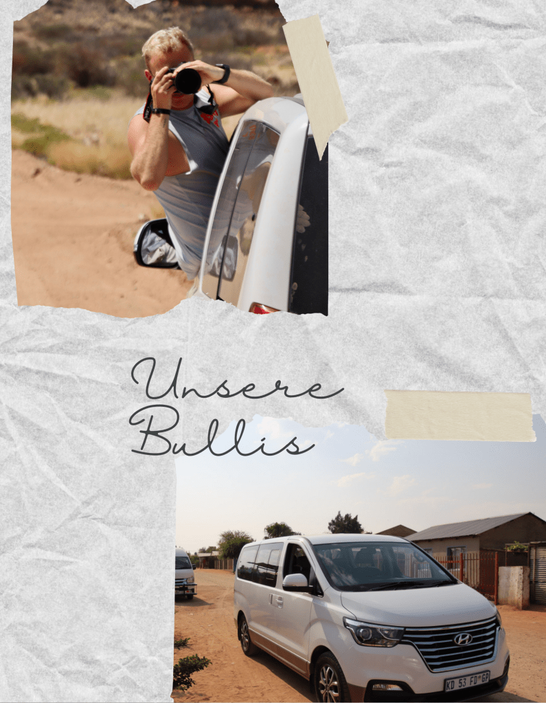 Fortbewegt durch das Land haben wir uns mit unseren 2 Bullis die wir vor Ort gemietet haben. Spannend war es mit dem Linksverkehr und Lenkrad auf der anderen Seite. Aber kein Problem, 2-3 mal falsch abgebogen und 2-3 mal doofe Kommentare von hinten bekommen und man lernt schnell 🙂 Eigentlich waren es 9 Sitze, aber das nimmt in SA keiner so ernst…
